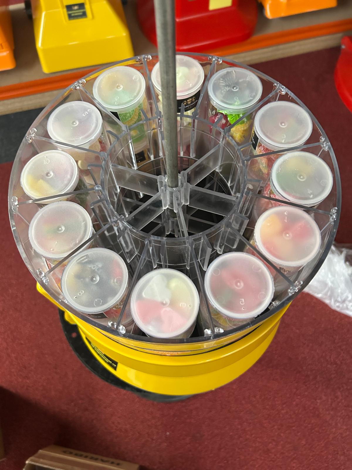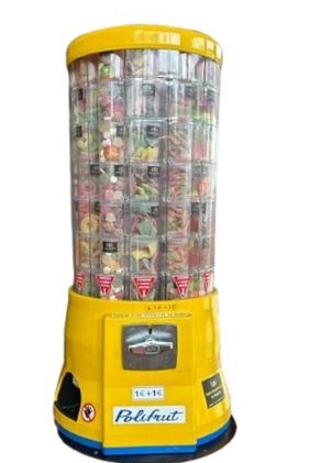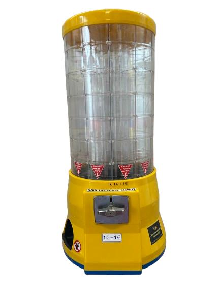 Snacktower 84 Candy 84 potjes per Vending Machine (12 rijen van 7 gevulde potjes) Prijs exclusief 21% btw Vending Machine is verkrijgbaar in de kleur geel De Vending Machines zijn standaard ingesteld op een invoer van twee munten, zijnde 2 x 1 euro De vulling voor deze automaten kunt u vinden op onze Snackpagina