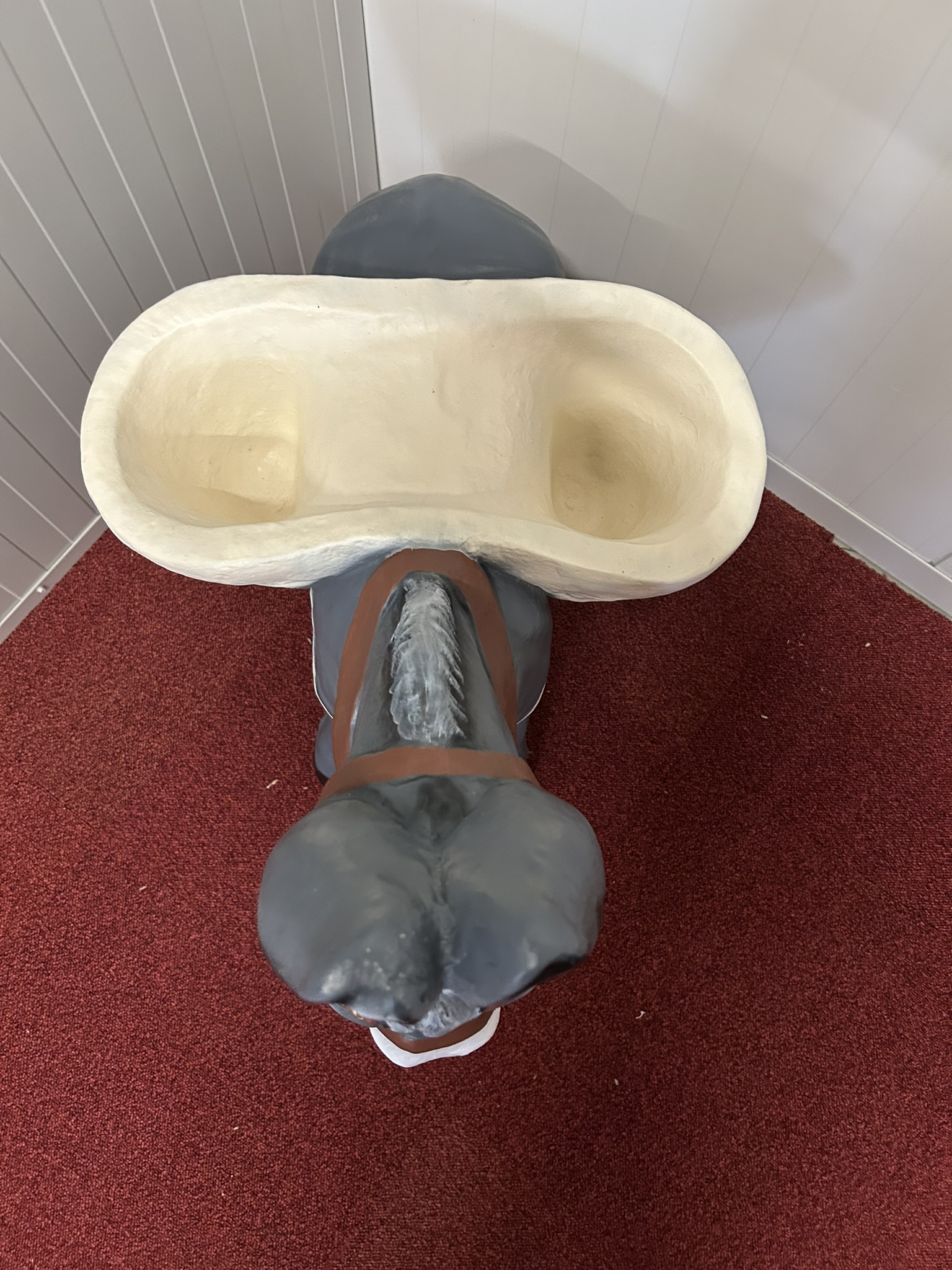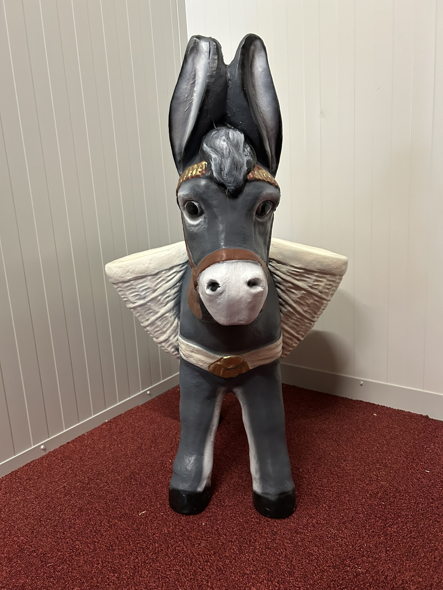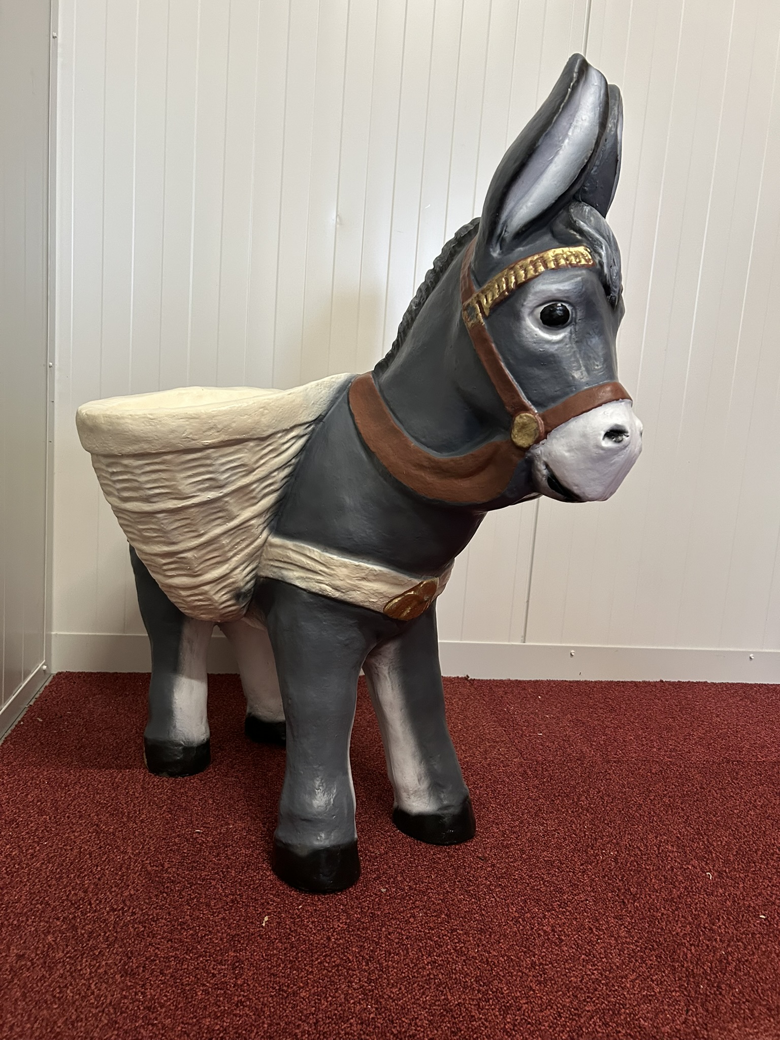 Grijze ezel, zeer realistisch en mooi afgewerkt, met 2 polyester witte mandjes die te gebruiken zijn als bloembak 70cm hoog Af te halen in Oude Pekela of tegen meerprijs te bezorgen
